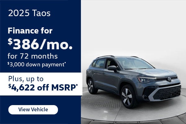 Payments based on $386 per month contract with $3,000 down for 72 months. Selling price $24,599. Plus taxes, tags, and $799 admin fee. With approved credit. Get up to $4,622 off MSRP on select 2025 Taos models with market discount. Not all customers will qualify for the total amount. See store for details. VIN #3VV8C7B20SM081178. 1 in stock. Offer ends 4/30/2026.