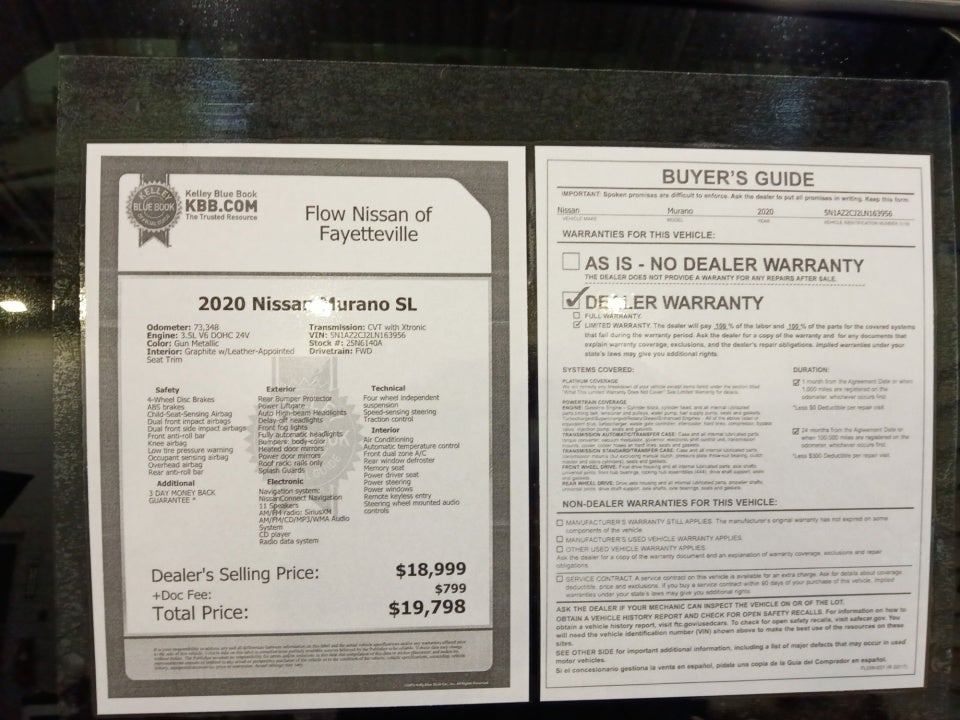 This 2020 Nissan Murano SL is well equipped with: Heated Leather Front and Rear Seats Power front seats Heated/Leather Wrapped steering wheel 20" Machined Aluminum Wheels NissanConnect with 8" Color Display Nissan door to door Navigation Streaming Audio via Bluetooth® Apple CarPlay & Android Auto Blind Spot Monitoring Lane Departure Warning BOSE Sound Power Liftgate Remote Start plus so much more!!!