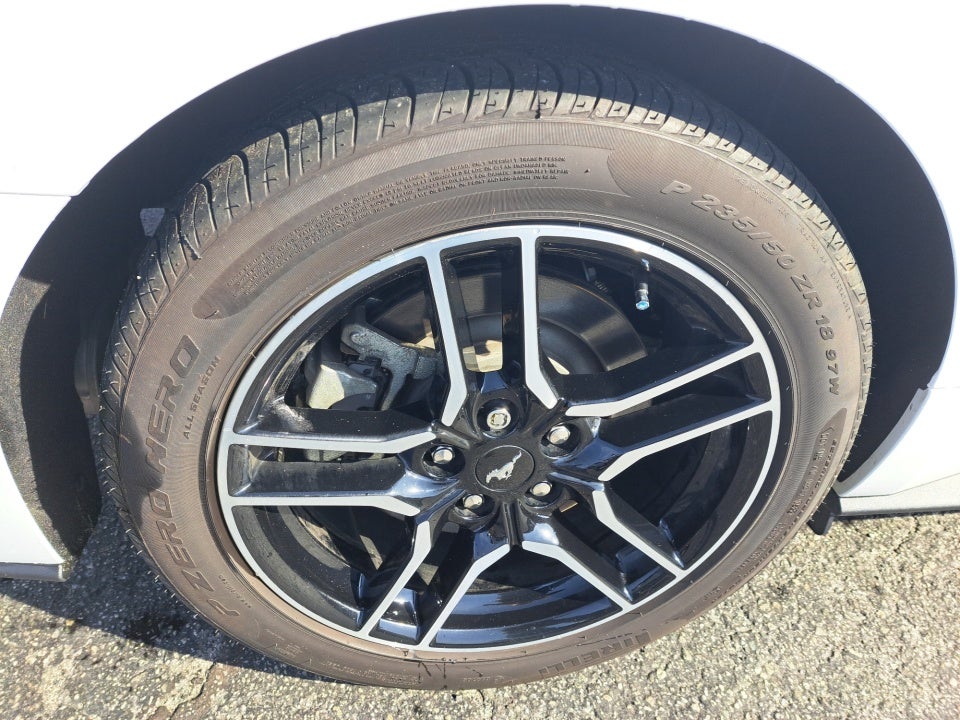 Complementing the Mustang's impressive performance is its sleek and athletic exterior. The striking white paint and bold design elements including the integrated turn signals and spoiler create a commanding presence on the road. The 18-inch machined-face aluminum wheels further accentuate the Mustang's sporty and sophisticated aesthetic.